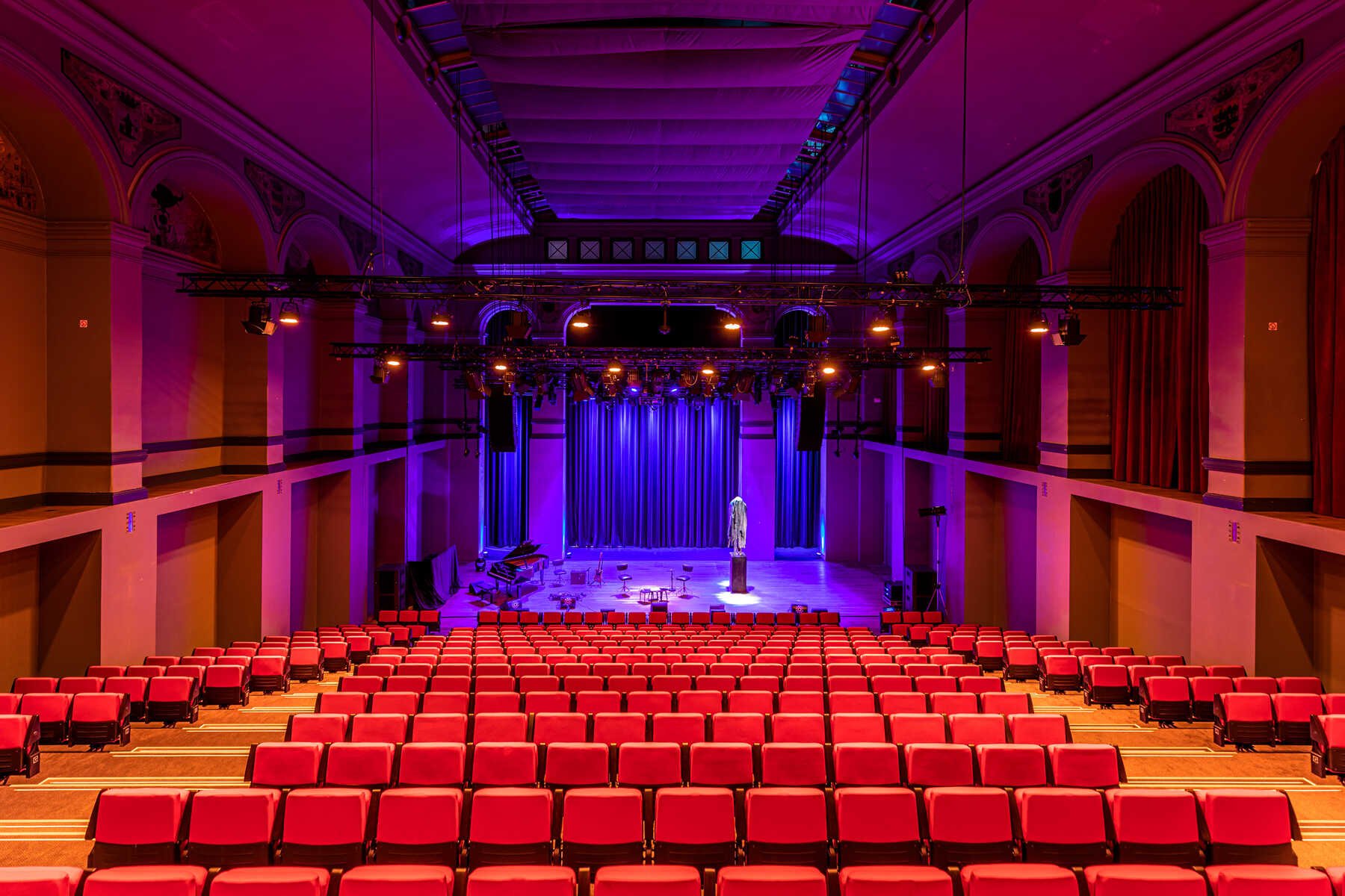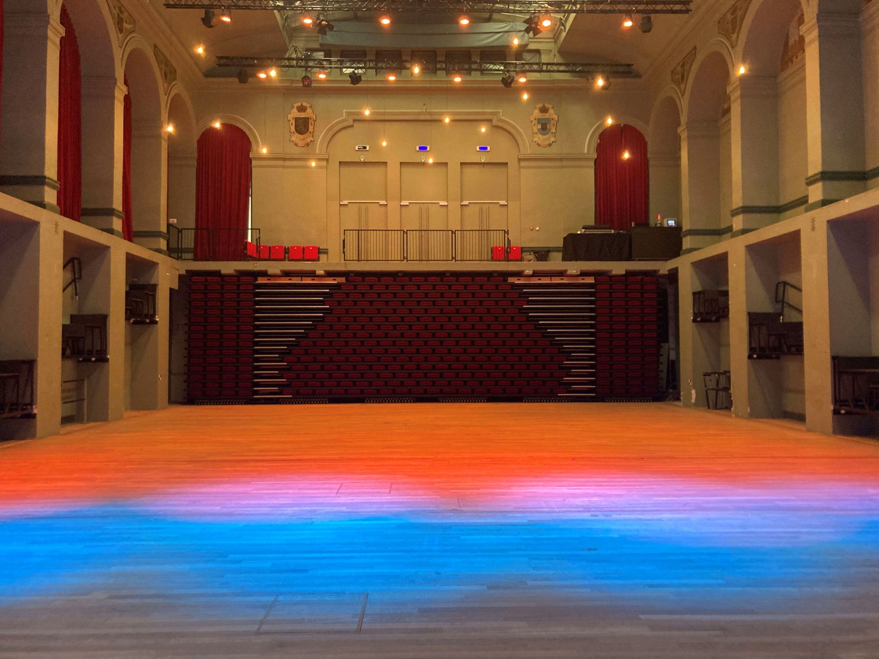 De zichtbare en onzichtbare metalen structuur is poedergecoat in RAL-9005 zwart. De vloeren zijn bekleed met projecttapijt Optima van Lano en de randen zijn afgewerkt met aluminium profielen. De twee gangpaden zijn voorzien van LED-fiberindicatoren om het publiek te wijzen op afstapjes wanneer ze naar hun stoelen lopen.